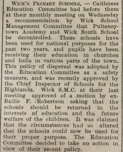 Similarly, the John O’Groat Journal reported that Wick School Management Committee had called for Pulteneytown Academy and Wick South School to be decontrolled by the Military: “These schools have been used for national purposes for the past two years, and pupils have been receiving their education in churches and halls in various parts of the town”; but now that the national situation had changed, “the schools could now be used for their proper purpose.” However the Education Committee had agreed on the policy of dispersal as a safety measure in the event of enemy air raids, and so the children would remain where they were.