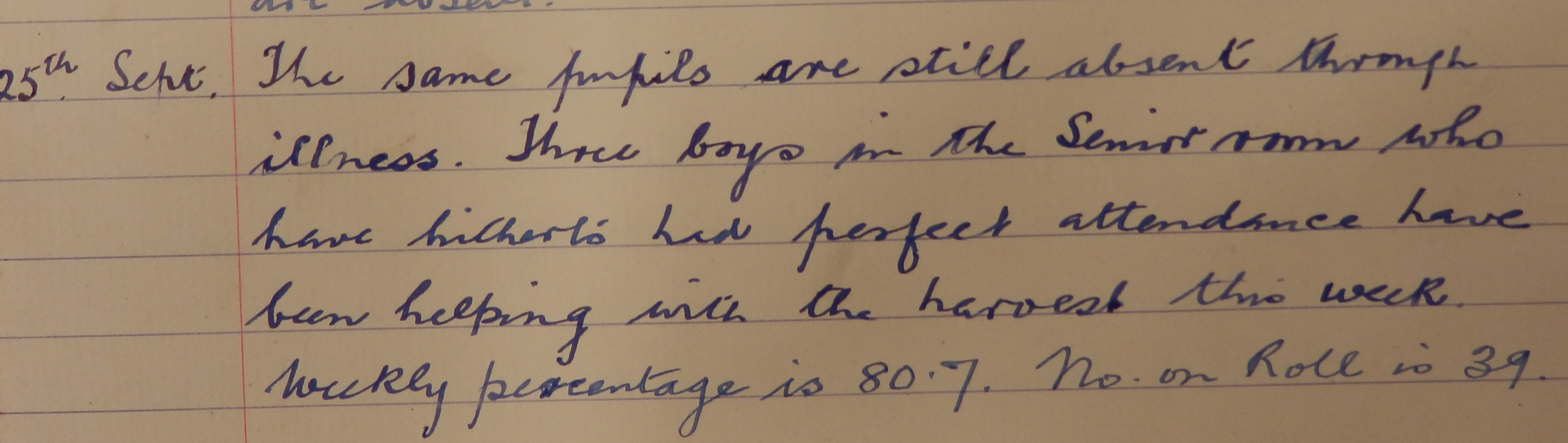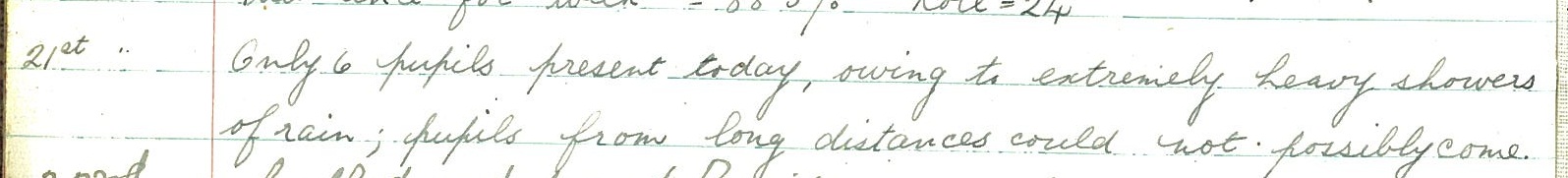 21 Sep 1942 Bower Stemster School - stormy weatherThe hopes for a dry end to the harvest were dashed this week as heavy rains came to Caithness. The log book for Stemster School in Bower on Monday 21 September says, “Only 6 pupils present today, owing to extremely heavy showers of rain; pupils from long distances could not possibly come.”