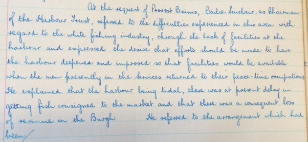 The Secretary of State for Scotland, the Right Hon. Thomas Johnston, paid a visit to Caithness this week and attended a special meeting of Thurso Burgh Council. Bailie Sinclair on behalf of the Harbour Trust expressed “the desire that efforts should be made to have the harbour deepened and improved so that facilities would be available when the men presently in the Services returned to their peace-time occupations. He explained that the Harbour being tidal, there was a present delay in getting fish consigned to the market and that there was consequent loss of revenue in the Burgh.”