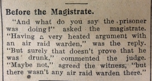25 Sep JOG Before the MagistrateFinally this week, the John O’Groat Journal printed a joke from the Air Raid Precaution service, headed “Before the Magistrate”: “And what do you say the prisoner was doing?” asked the magistrate. “Having a very heated argument with an air raid warden,” was the reply. “But surely that doesn’t prove that he was drunk,” commented the judge. “Maybe not,” agreed the witness, “but there wasn’t any air raid warden there.”