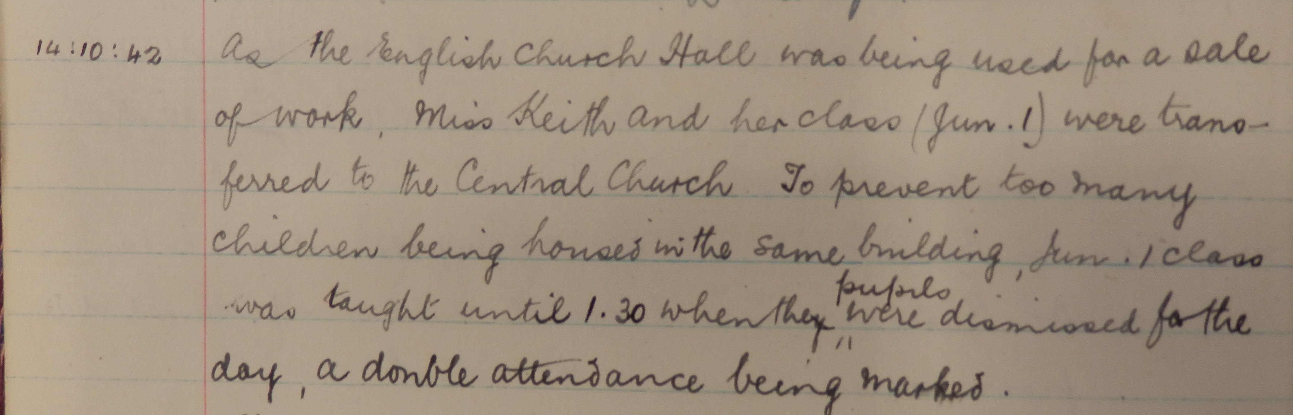 As several of the schools in Wick had been taken over by the military the children were receiving their education in church and village halls around the town. This brought its own problems, however, as the log book for Pulteneytown Academy shows in an entry dated 14 October: “As the English Church Hall was being used for a sale of work, Miss Keith and her class (Jun. I) were transferred to the Central Church. To prevent too many children being housed in the same building, Jun. I class was taught until 1.30 when the infants were dismissed for the day, a double attendance being marked.”