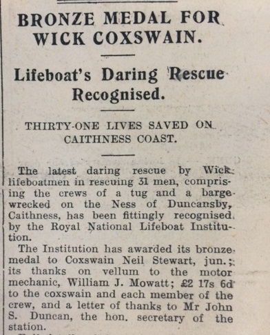 Finally this week, the John O’Groat Journal reported that the daring rescue by the crew of Wick lifeboat of 31 men