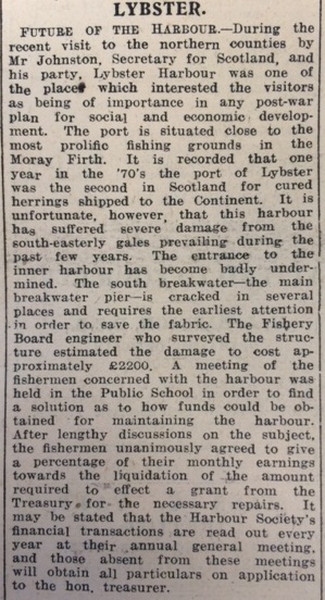 The John O’Groat Journal reported this week that the recent visit of the Secretary of Scotland to Lybster had revived interest in repairing the harbour, which had been damaged down the years by severe weather: “The entrance to the inner harbour has become badly undermined. The South breakwater – the main breakwater pier – is cracked in several places.” The cost of repairs was estimated at £2,200, but “After lengthy discussions on the subject, the fishermen unanimously agreed to give a percentage of their monthly earnings” towards securing a Treasury grant for the necessary repairs.”