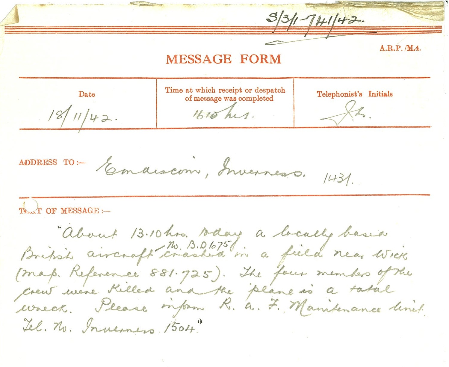 On 18 November the Caithness Constabulary passed on the following melancholy message to their colleagues in Inverness: “About 13.10 hours today a locally based British aircraft No. B.D.675 crashed in a field near Wick… The four members of the crew were killed and the plane a total wreck. Please inform R.A.F. Maintenance Unit Tel. No. Inverness 1504.”