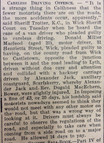 The John O’Groat Journal reported this week that a van driver, Donald Miller, had been fined £20 for careless driving. The accident happened on the county road from Wick to Castletown, when Miller had turned out of the junction with the Lyth road without looking to see if anyone was coming and collided with another car. As Sheriff Trotter observed moodily in court, “It is a strange thing in Caithness that the fewer motorists there are on the roads, the more accidents occur, apparently.”