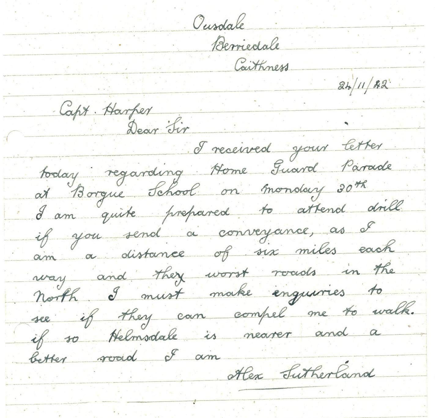 On 24 November Alex Sutherland of Ousdale south of Berriedale Braes wrote to Captain Harper of the Home Guard, having been ordered to attend a parade at Borgue School next week. It’s safe to say he was not happy: “I am quite prepared to attend drill if you send a conveyance, as I am at a distance of six miles each way and the worst roads in the north. I must make enquiries to see if they can compel me to walk, if so Helmsdale is nearer and a better road.”