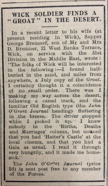 Bremner of Wick to his wife, of a remarkable find in the desert: “I found half-buried in sand, and miles from anywhere, a July copy of the Groat… There was I making my way across the desert, following an old camel track, and the familiar old English type (the John O’Groat Journal heading) fluttering in the breeze. The driver stopped while I picked it up.” George Bremner added that, while he didn’t know anyone in the births, marriages and deaths column, he noticed “that you had ‘Hatter’s Castle’ at the local cinema, and that you had the Gala as usual.’ He finished poignantly, “I read it through very hungrily, and it made me homesick.”