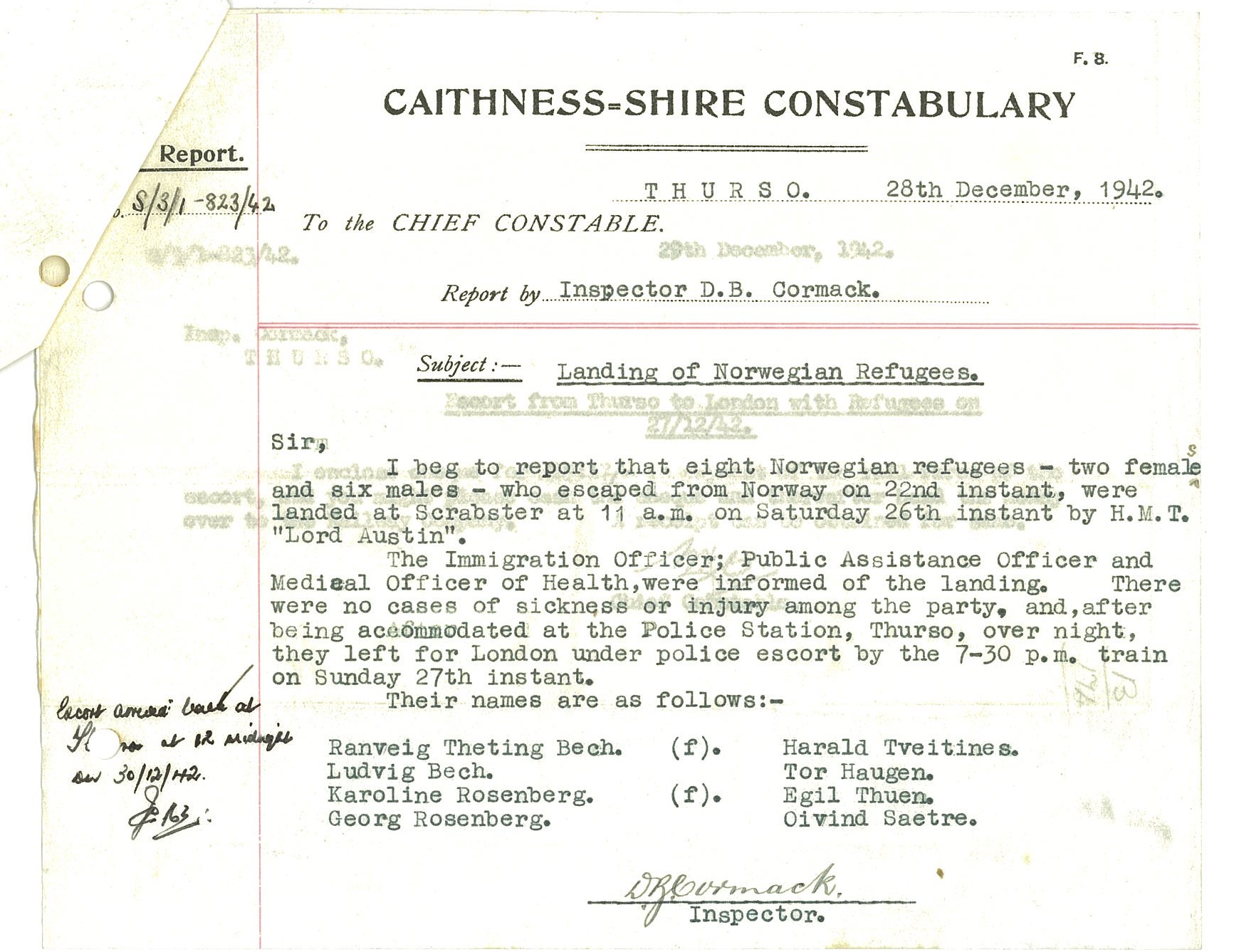 In some ways, the New Year began much like the old with the arrival in Caithness of a party of refugees. The police report of 28 December states: “I beg to report that eight Norwegian refugees – two female and six males – who escaped from Norway on 22nd instant, were landed at Scrabster at 11 a.m. on Saturday 26th instant by H.M.T. “Lord Austin”. After staying overnight in Thurso the party too the train for London with a police escort.