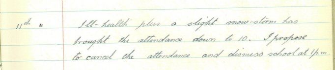 11-mar-bower-school-snowstorm-illness-2In Caithness, winter was still hanging on, as the log book for Bower School shows. On 11 March the head teacher recorded, “Ill-health plus a slight snow-storm has brought the attendance down to 10. I propose to cancel the attendance and dismiss school at 1 pm.”