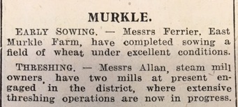 The farming year was well underway across the county. The district report for Murkle in the John O’Groat Journal reported that Messrs Farrier of West Murkle Farm had completed early sowing of wheat, and “Messrs Allan, steam mill owners, have two mills at present engaged in the district, where extensive threshing operations are now in progress.”