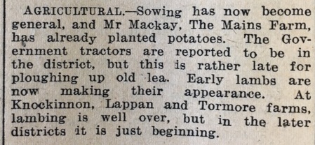 2 Apr JOG Dunbeath AgricultureThe John O’Groat Journal reported that Dunbeath, farmers were sowing and some were already planting potatoes. “The Government tractors are reported to be in the district, but this is rather late for ploughing up old lea [an open area of grassy or arable land].” The lambing season was now underway as well: “At Knockinnon, Lappan and Tormore farms lambing is well over, but in the later districts it is just beginning.”