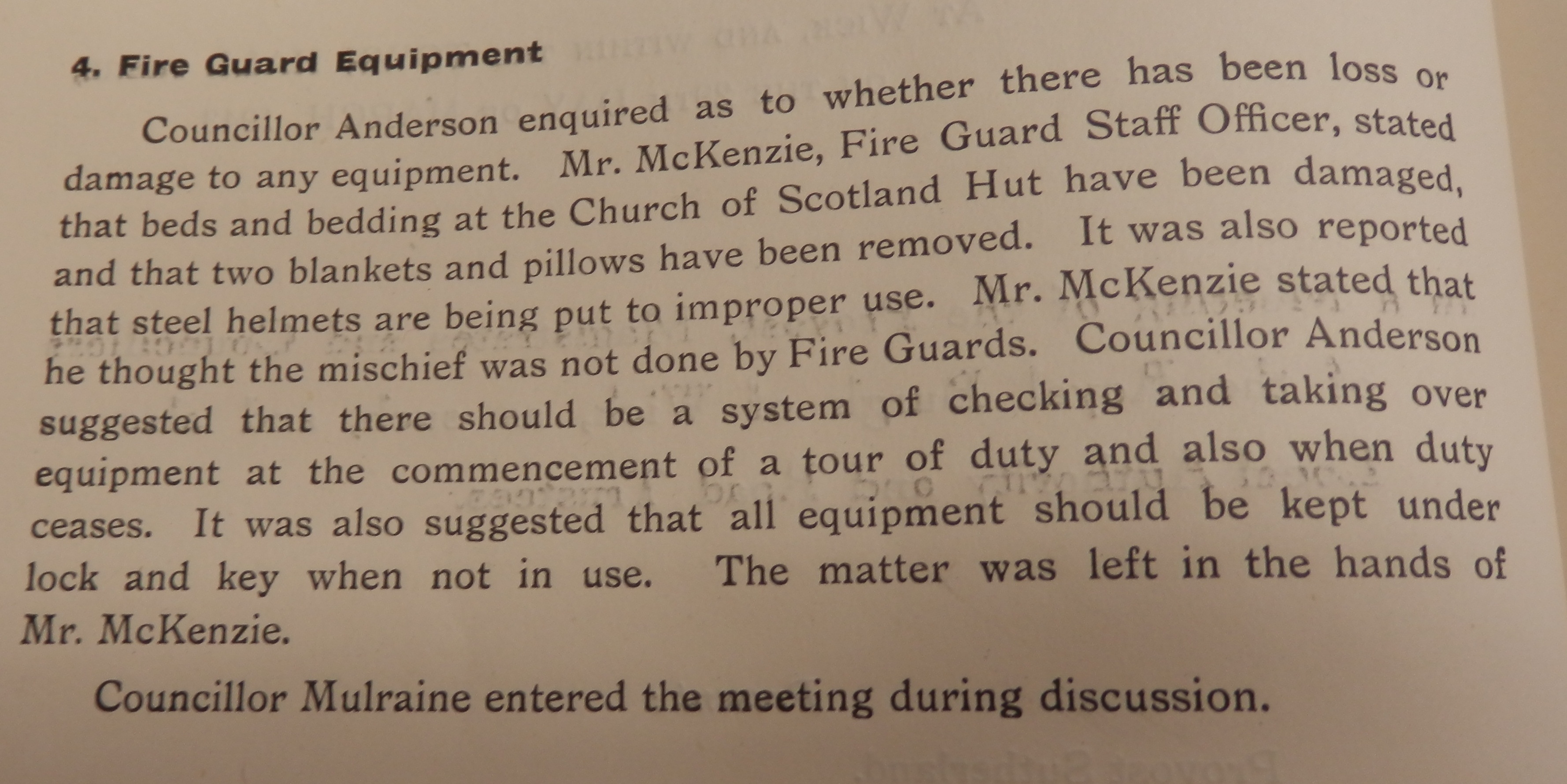 Wick Burgh Council was concerned about fire guard equipment. At a meeting on 29 March, “Mr McKenzie, Fire Guard Staff Officer, stated that beds and bedding at the Church of Scotland Hut have been damaged, and that two blankets and pillows have been removed. It was also reported that steel helmets are being put to improper use.” The Council suggested that the equipment be kept “under lock and key when not in use” and there the matter rested.