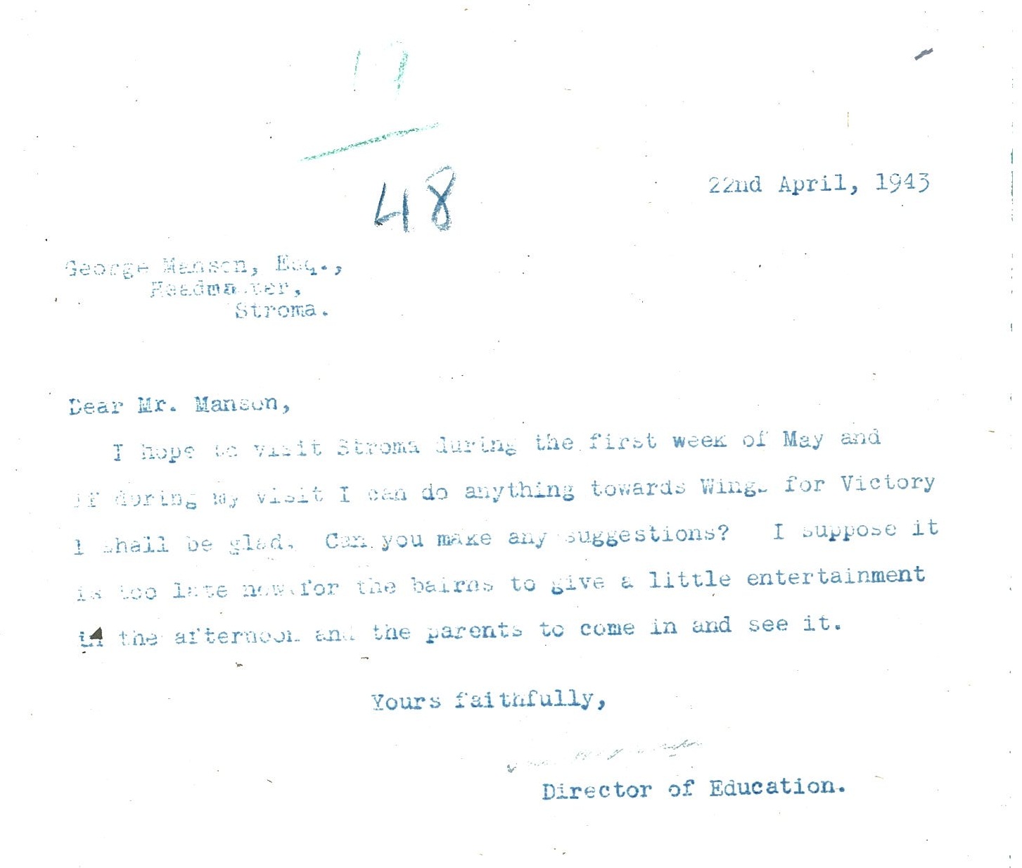 The county was gearing up for “Wings for Victory” week. The Director of Education wrote on 22 April to the Head Teacher of Stroma School, “Can you make any suggestions? I suppose it is too late now for the bairns to give a little entertainment in the afternoon and the parents to come in and see it.”