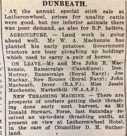 In Caithness farmers were busy across the county with land work and early potato planting. The John O’Groat Journal reported that in Dunbeath, “Government tractors are busy ploughing up holdings which used to carry a pair of horses.” It also noted that, “There are prospects of crofters getting their thrashing done early next harvest, as Mr Donald Stewart, Forse, last Saturday received an up-to-date thrashing outfit, at present on view at Latheronwheel Hotel.”