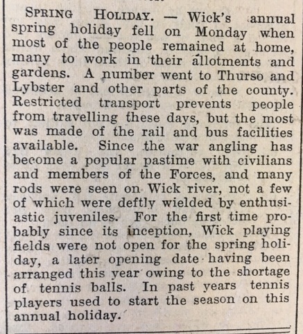 Finally this week, the John O’Groat Journal reported Wick’s spring holiday last week, noting that “Restricted transport prevents people from travelling these days”. The war had imposed other restrictions, however: “For the first time probably since its inception, Wick playing fields were not open for the spring holiday, a later opening date having been arranged this year owing to the shortage of tennis balls. In past years tennis players used to start the season on this annual holiday.”