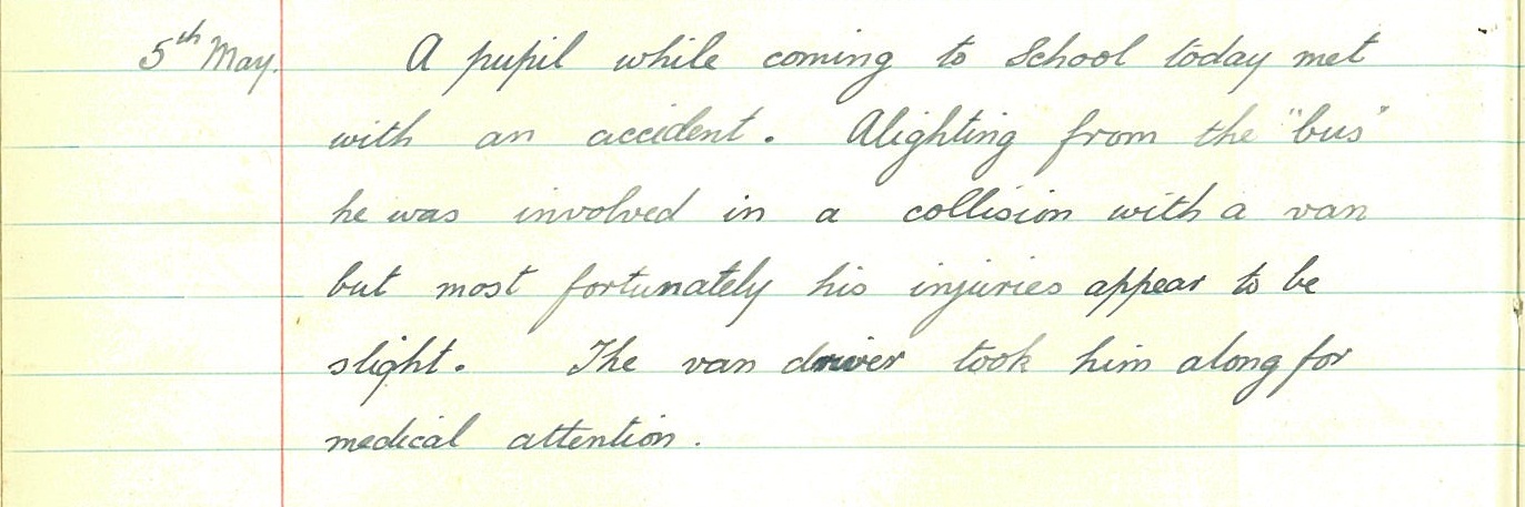 5 May Bower School AccidentThe Head Teacher of Bower School recorded an accident outside the school on 5 May, which luckily was not serious: “A pupil while coming to School today met with an accident. Alighting from the “bus” he was involved in a collision with a van but most fortunately his injuries appear to be slight. The van driver took him along for medical attention.” According to the police report, “the accident was due to the boy rushing into the roadway from behind the bus”.