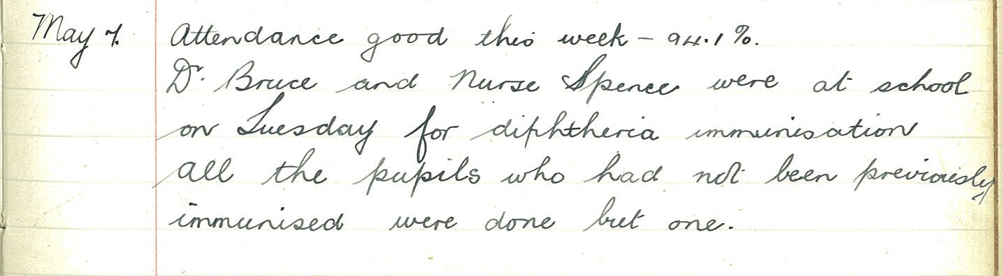 7 May Ackergill school ImmunisationThe children of Ackergill School were in for a shock on Friday 7 May: “Dr Bruce and Nurse Spencer were at school on Tuesday for diphtheria immunisation. All the pupils who had not been previously immunised were done but one.”