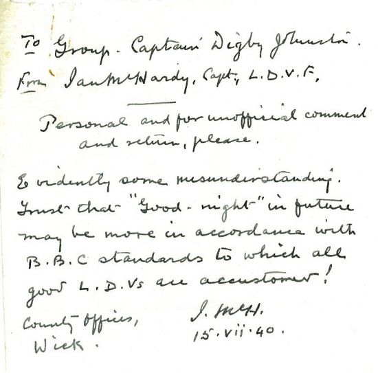 RAF Wick, with the following good-humoured note (marked, “personal and for unofficial comment and return”). “Evidently some misunderstanding. Trust that “Good-night” in future may more in accordance with B.B.C. standards to which all good L.D.V.s are accustomed!”