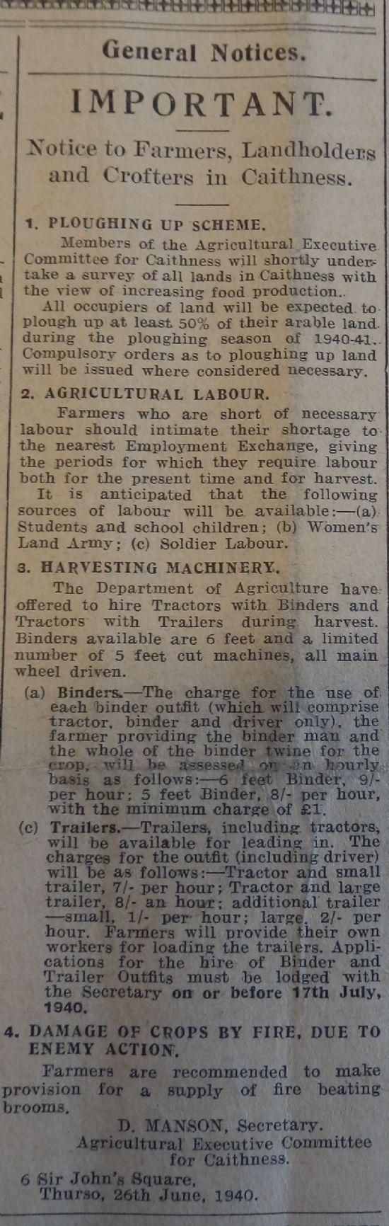This week a notice appeared in the John O’Groat Journal addressed to “Farmers, Landholders and Crofters in Caithness”, stating that all lands in the county would shortly be surveyed with a view to increasing food production. “All occupiers of land will be expected to plough up at least 50% of their arable land during the ploughing season of 1940-41”, and adding that compulsory orders could be issued “where necessary”. Farmers who were short of labour would be able to call on “(a) students and school children; (b) Women’s Land Army; (c) Soldier Labour”.