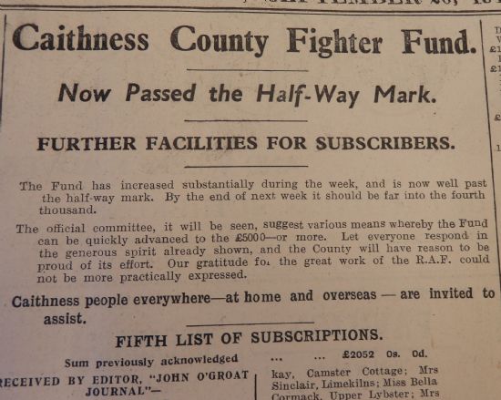 The people of Caithness continued to raise funds to pay for a “Caithness” fighter plane. The John o’Groat Journal reported this week that the fund was now over half way towards its target, and was even expected to reach over £4,000 next week. With the Battle of Britain still raging over the skies of Britain, “Our gratitude for the great work of the RAF could not be more practically expressed”.