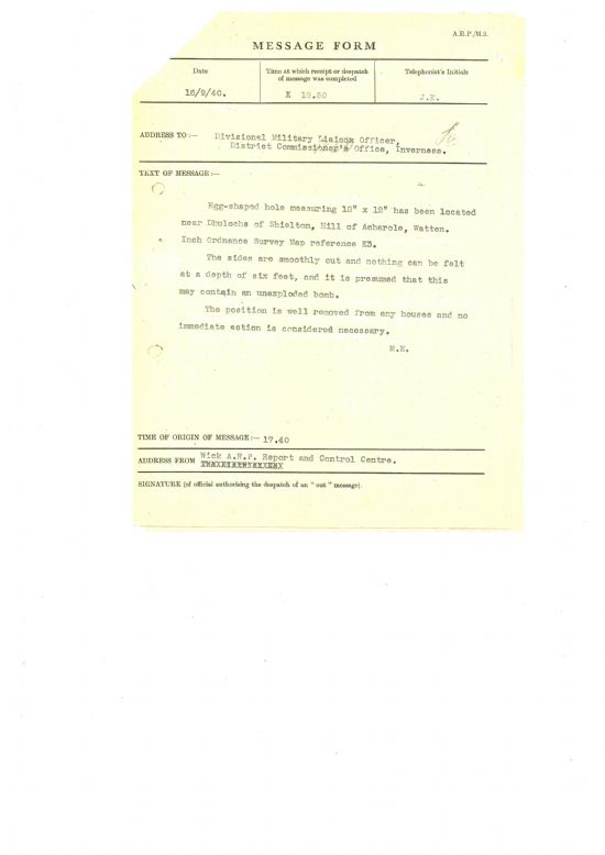 Also in Watten, an unexploded bomb was reported to the police on 16 September: “Egg-shaped hole measuring 18” by 12” has been located near Dhulochs of Shielton, Hill of Acharole, Watten… The sides are smoothly cut and nothing can be felt at a depth of six feet, and it is presumed that this may contain an unexploded bomb. The position is well removed from any houses and no immediate action is considered necessary.”