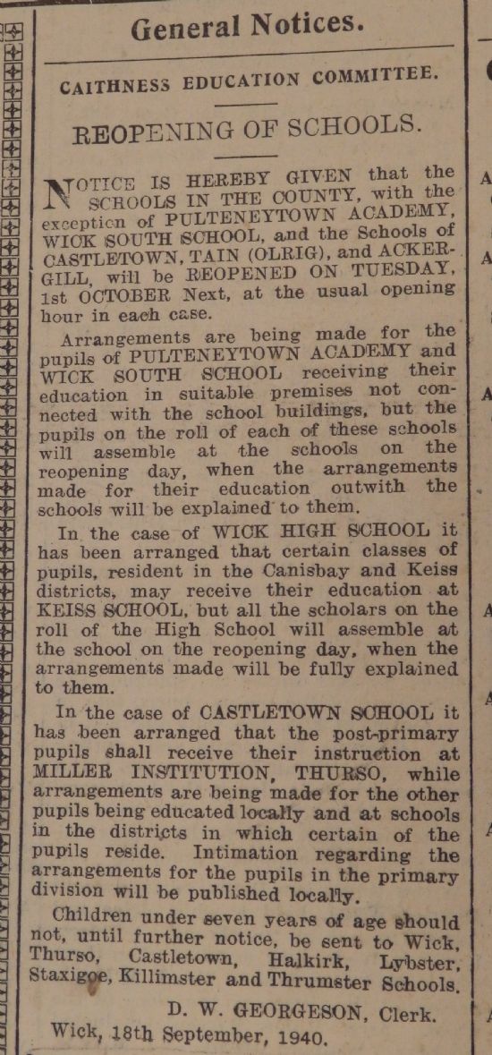 Meanwhile, in Caithness, the long school summer holiday (schools had broken up in June) was finally at an end. Week 56 reopening of schools (john ogroat journal 27.09.1940)Notice was given that schools would reopen next week, with the exceptions of Pulteneytown Academy, Wick South School, and Castletown, Tain (in Olrig) and Ackergill. Pupils at Pulteneytown Academy and Wick South School would be taught in other buildings in the town. It’s clear from this which parts of the county were seen as being at greatest risk, and also, “Children under seven years of age should not, until further notice, be sent to Wick, Thurso, Castletown, Halkirk, Lybster, Staxigoe, Killimster and Thrumster Schools.”