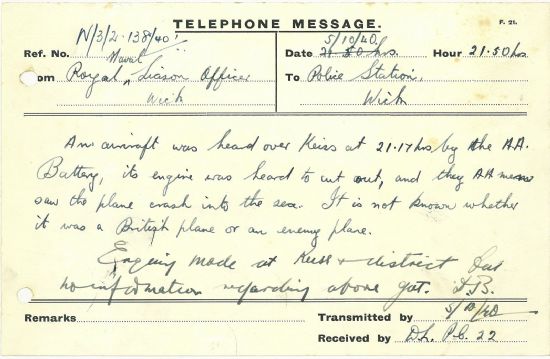 Although Hitler had postponed the invasion again, the skies above Caithness still saw plenty of activity. The police recorded that “An aircraft was heard over Keiss at 21.17 hours by the A.A. Battery, its engine was heard to cut out, and the A.A. men saw the plane crash into the sea. It is not known whether it was a British plane or an enemy plane.”