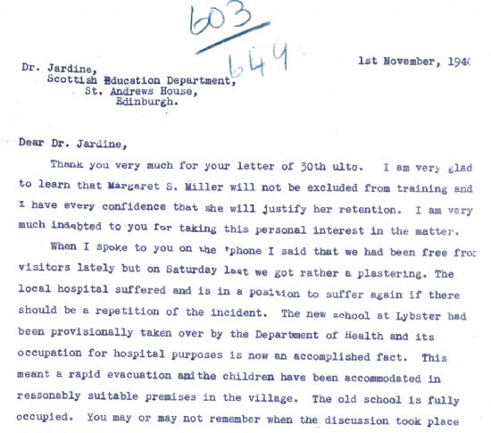 Week 62 dir ed letter 1 nov plastering“In Caithness, Mr M’Hardy, Director of Education, wrote to a correspondent about the recent bombing of Wick. “When I spoke to you on the ‘phone I said that we had been free from visitors lately but on Saturday last we got rather a plastering. The local hospital” [i.e., Bignold Cottage Hospital] “suffered and is in a position to suffer again if there should be a repetition of the incident. The new school at Lybster had been provisionally taken over by the Department of Health and its occupation for hospital purposes is now an accomplished fact.”