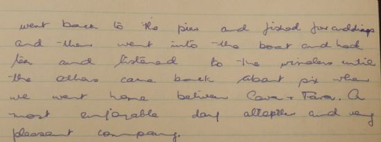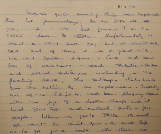 Week 62 hetty munro diaries 001Finally this week, Hetty Munro over in Orkney recorded in her diary that she and a friend took a break from war work and went for a sail with a colleague down to Flotta. Week 62 hetty munro diaries 002“We went between Lyness and Cava and saw lots of warships – Hood, Repulse, Didos and several destroyers – including, in the floating dock, the destroyer which had been the victim of an explosion. Evidently one of the sub-lieutenants had been playing about with the fuse of a depth charge and it had gone off and killed quite a few people.” They went for a walk and did some fishing, and got back around 6 pm: “A most enjoyable day altogether.”