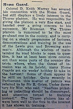 Finally this week, the John O’Groat Journal reported a change of leadership for the Thurso Home Guard platoon, as Colonel D. Keith Murray was stepping down. This was reported in “Thurso Notes” by “Thor”, so the writer may not been altogether unbiased, but he claimed, “The Thurso platoon is rumoured to be the most go-ahead one in the county, and is carrying on a steady programme of lectures, demonstrations and training in the use of the Lewis gun and Browning automatic. Although,” he continued, “the wisdom of maintaining its road blocks is open to question, it has at least been more consistent than some parts of the country districts where, when the threat of invasion was at its height, many Home Guards got six weeks’ holiday to take in the harvest!” And Thor waspishly concluded, “Some of them appear to be still on holiday…”