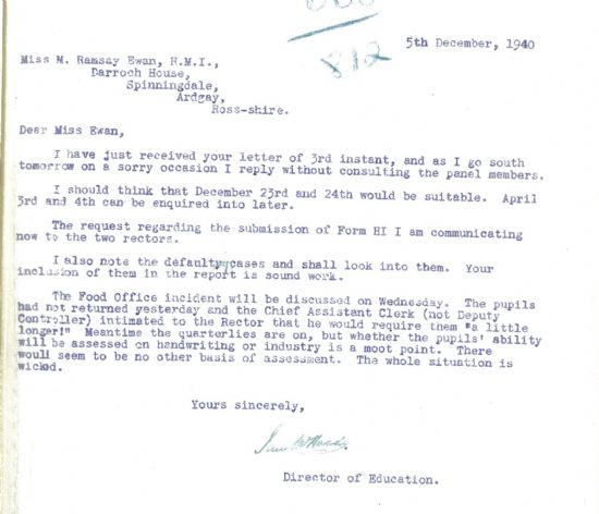 Meanwhile, the Director of Education was outraged to discover that some children had been taken to work in the local Food Office when they should have been taking exams. On 5 December he wrote, “The pupils had not returned yesterday and the Chief Assistant Clerk … intimated to the Rector that he would require them ‘a little longer!’ Meantime the quarterlies are on, but whether the pupils will be assessed on handwriting or industry is a moot point … The whole situation is wicked.”