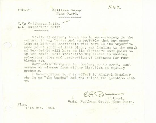 Week 67 13 dec p567-9 hg re defence berriedaleMeanwhile, the Home Guard were considering the defence of Caithness in the event of a German invasion. With regard to Berriedale, “any enemy landing North of Berriedale will have as its objective some point North of that place; any landing to the south of Berriedale will have as its objective some point to the south … Berriedale being on the border, so to speak, must assume an advance from either direction as equally probable.”