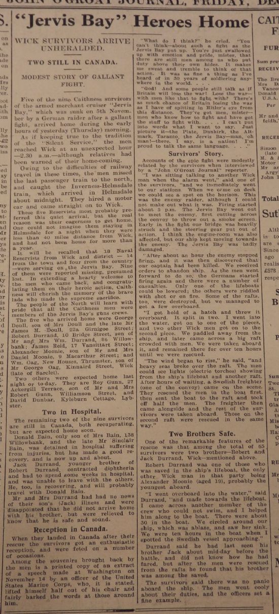 Week 67 13 dec wick burgh p4 jervis bay survivorsThis week five of the nine Caithness survivors of HMS Jervis Bay, which had been sunk on 5 Week 67 jervis bay 002November sacrificing itself to give the convoy she was protecting time to scatter, returned home; they got back at about 2.30am. They’d missed the last train to Wick from Inverness, so they caught a train to Helmsdale which got in around midnight; and rather than stay the night there and come on next day, preferred to hire a car. Also this week, Wick Burgh Council resolved to “put on record the splendid work done by these men” and arrange for a civic reception: “It was also agreed to record the Council’s deep sympathy with the relatives of those men who had lost their lives.”