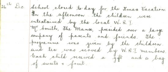 Finally this week, Dunnet School broke up for the holidays on Christmas Eve: “In the afternoon the children were entertained by the local W.R.I. [Women’s Rural Institute]. Mr Smith, The Manse, presided over a large company of parents and friends. The programme was given by the children and tea was served by W.R.I. members. Each child received a gift and a bag of sweets & fruit.”