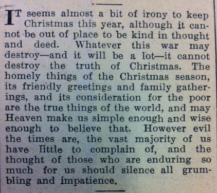 will be a lot – it cannot destroy the truth of Christmas. The homely things of the Christmas season, its friendly greetings and family gatherings, and its consideration for the poor are the true things of the world … However evil the times are, the vast majority of us have little to complain of, and the thought of those who are enduring so much for us should silence all grumbling and impatience.”