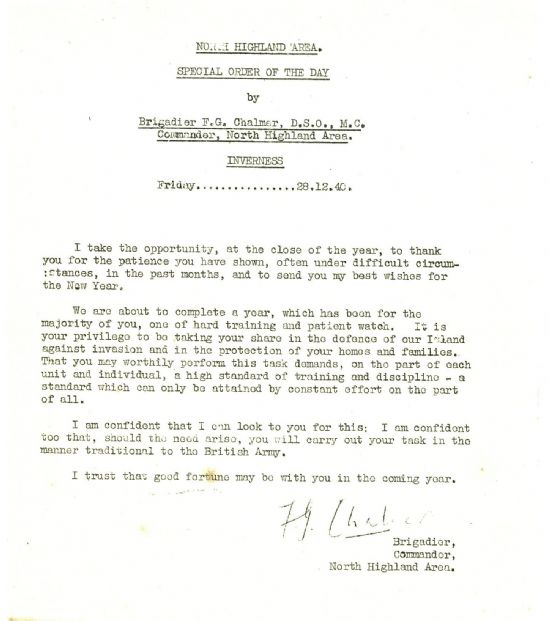 In his year end message to the Home Guard of the North Highland Area, Brigadier F.G. Chalmer wrote: “I take the opportunity, at the close of the year, to thank you for the patience you have shown, often under difficult circumstances, in the past months, and to send you my best wishes for the New Year. We are about to complete a year, which has been for the majority of you, one of hard training and patient watch. It is your privilege to be taking your share in the defence of our Island against invasion and in the protection of your homes and families … I trust that good fortune may be with you in the coming year.”