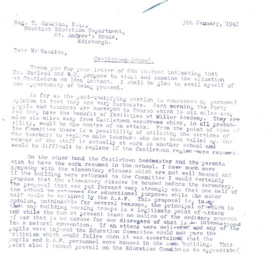 and the school to share Castletown School building. “This proposal is, in my opinion, unthinkable for several reasons, the principal of which is that any building housing troops is a legitimate point of attack and while the Hun at present takes no notice of the ordinary menaces of war that is no excuse for our disregard of what is in international law a natural convention… I cannot prevail on the Education Committee to appreciate [this].”