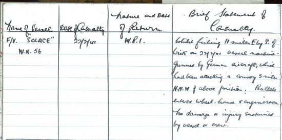 Week 78 22 feb solace attackedA German raider attacked a Wick-registered fishing boat, the Solace, WK56, last week. The Receiver of Wrecks noted the incident in his log: “Whilst fishing 11 miles E. by S. of Wick on 22/2/41 vessel machine-gunned by German aircraft, which had been attacking a convoy 3 miles N.N.W. of above position. Bullets entered wheel house & engine room, no damage or injury sustained by vessel or crew.”