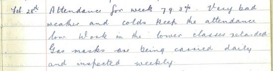 Week 78 28 feb jog school log gas masksIn Caithness, the bad weather continued. John O’Groats School recorded in its log book for 28 February, “Attendance for week 79.3%. Very bad weather and colds keep the attendance low. Work in the lower classes retarded. Gas masks are being carried daily and inspected weekly.”