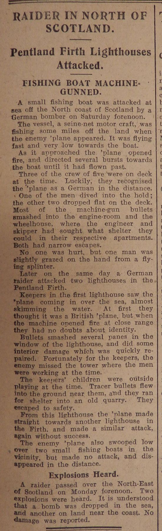 The John O’Groat Journal reported the incident this week, adding that three of the crew were on deck when the Week 78 raider in north of scotland 28.02.1941fighter attacked: “One of the men dived into the hold; the other two dropped flat on the deck. Most of the machine-gun bullets smashed into the engine-room and the wheelhouse, where the engineer and skipper had sought what shelter they could.” The plane went on to attack two lighthouses in the Pentland Firth and in one of them the keeper’s children had a narrow escape: “tracer bullets flew into the ground near them and they ran for shelter into an old quarry.” Fortunately no one was seriously injured.