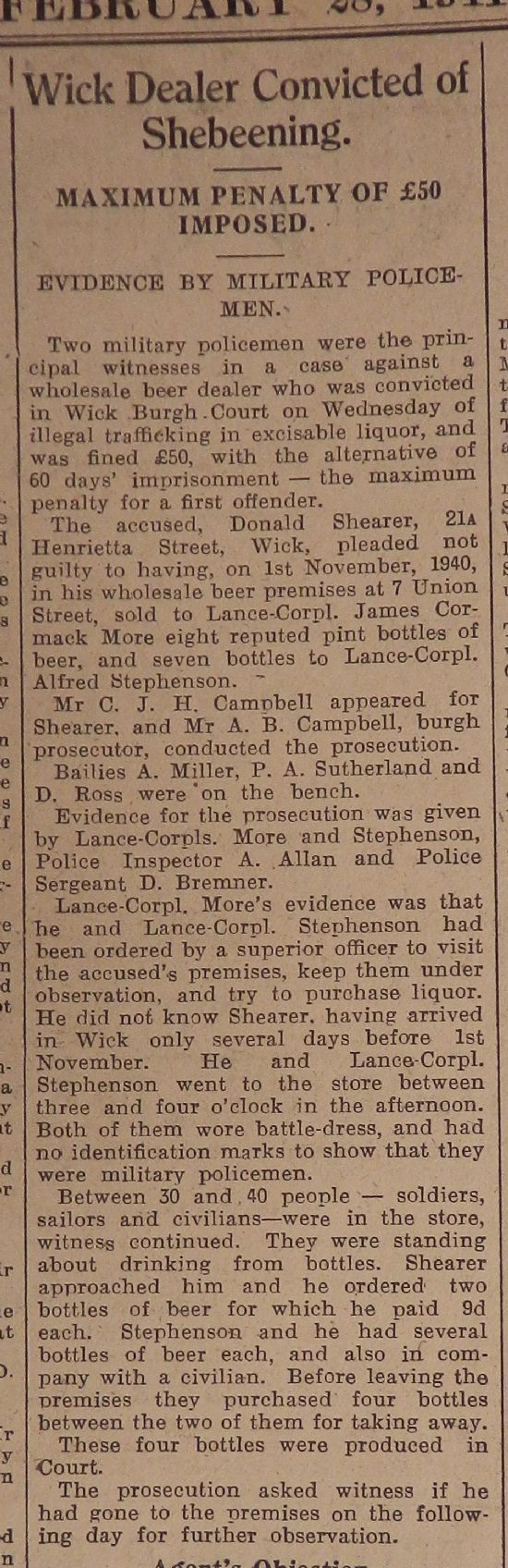 Week 78 wick dealer shebeening (pt1)In Wick, a wholesale beer dealer was convicted of shebeening, or operating an unlicensed Week 78 wick dealer shebeening (pt2)drinking establishment at his premises in Union Street. He was caught when he sold two military policemen an impressive 15 bottles of beer between them (only four of which were used in evidence). The policemen testified that, “Between 30 and 40 people – soldiers, sailors and civilians – were in the store … standing about drinking from bottles.” Although the accused denied the charges and insisted that he had never seen the two policemen before, he was found guilty by the magistrates and fined £50.