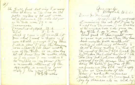 to complain about the use being made of the hall by the local platoon. “I … gave the key of the hall to some of the home guard at their request over a year ago. Since then they have been using the hall without asking or obtaining authority to do so. To bring matters to a head at the request of the Committee I held back the key & when they called here for it I told them they had to get some authority to answer for the damage they were doing the hall & pay some of the expenses so they told me to apply to you.”