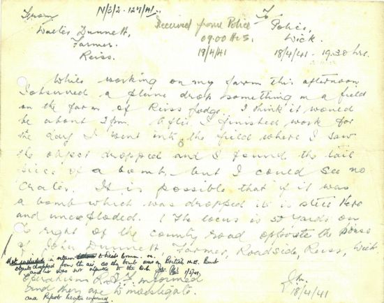 working on my farm this afternoon I observed a plane drop something in a field on the farm of Reiss Lodge. I think it would be about 2 pm. After I finished work for the day I went into the field where I saw the object dropped and I found the tail piece of a bomb but I could see no crater. It is possible that if it was a bomb which was dropped it is still there and unexploded.” A note in the margin of the report explains that the incident wasn’t reported, “as the bomb was a British H.E. [high explosive] Bomb”.