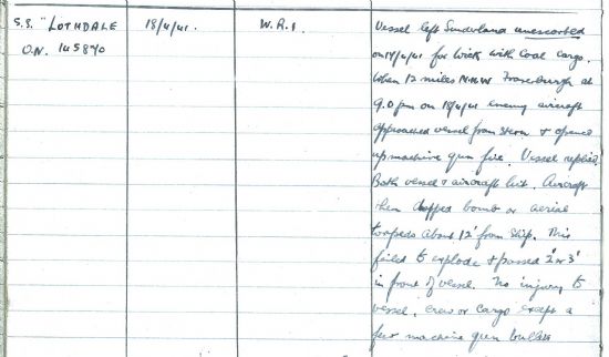 The Receiver of Wrecks noted a dramatic attack (and a lucky escape) at sea in an entry about the SS Lothdale this week in his log: “Vessel left Sunderland unescorted on 17/4/41 for Wick with coal cargo. When 12 miles N.N.W. Fraserburgh at 9.00 pm on 18/4/41 evening aircraft approached vessel from stern & opened up machine gun fire. Vessel replied. Both vessel and aircraft hit. Aircraft then dropped bomb or aerial torpedo about 12 feet from ship. This failed to explode & passed 2 or 3 feet in front of vessel. No injury to vessel, crew or cargo except a few machine gun bullets”