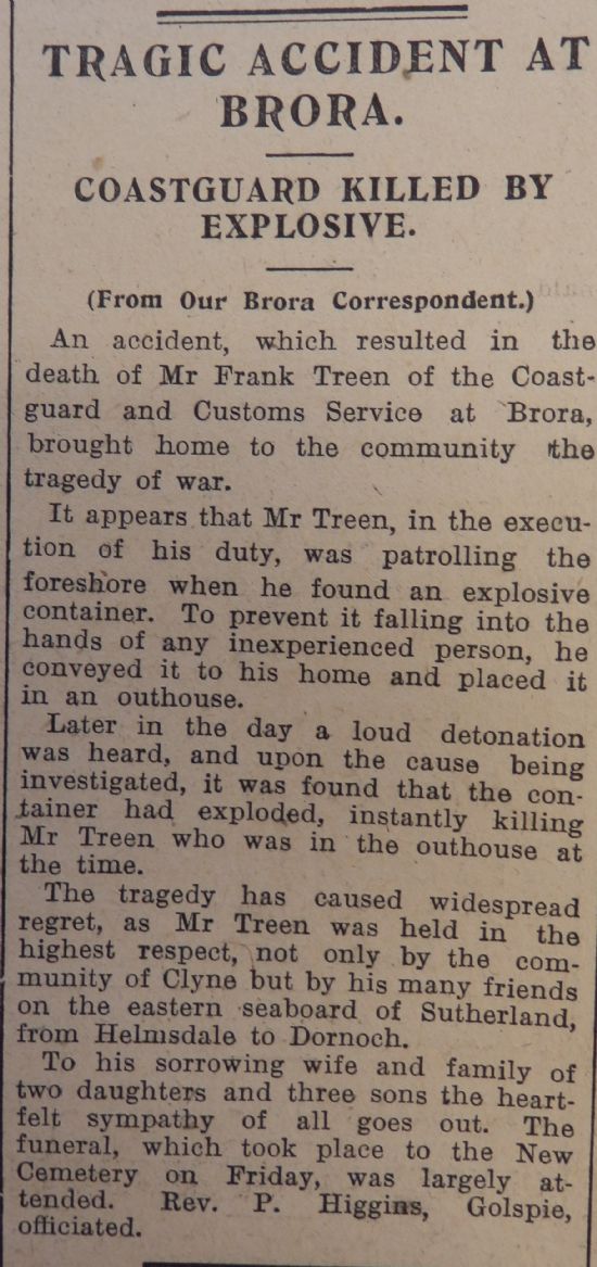 The John O’Groat Journal reported a fatal accident with a mine at Brora, when Mr Frank Treen, the local coastguard, found an explosive container. “To prevent it falling into the hands of any inexperienced person, he conveyed it to his home and placed it in an outhouse. Later in the day a loud detonation was heard, and … it was found that the container had exploded, instantly killing Mr Treen who was in the outhouse at the time.”