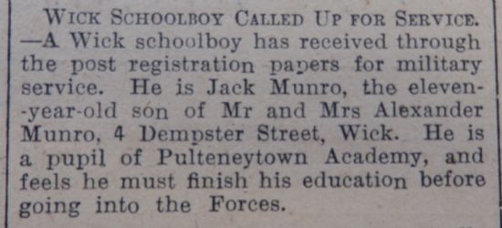 Finally this week the John O’Groat Journal reported an unusual call-up for military service. “A Wick schoolboy has received through the post registration papers for military service. He is Jack Munro, the eleven year-old son of Mr and Mrs Alexander Munro, 4 Dempster Street, Wick. He is a pupil of Pulteneytown Academy, and feels he must finish his education before going into the Forces.”