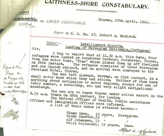 Four Scandinavian refugees were landed at Scrabster Harbour on Sunday. “The men left Alesund, Norway, on 23rd instant, in a small motor boat which they had stolen. Neither of them knew anything about navigation or motor engines, except for one of their number, a schoolboy, who had very slight navigational knowledge.” The group had been picked up off Shetland the day before. Three of the men were just 19 years old, the other was 22.