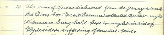 At the start of the month the Luftwaffe had mounted a heavy bombing raid on a number of British cities, among them Clydeside. Now, on 23 May, the head teacher of Gillock School recorded in the log book: “The sum of 13s 3d was disbursed from the penny-a-week Red Cross box. Essie Bremner collected 12s 3d last night. A dance is being held here to-night in aid of Clydesiders suffering from air raids.”