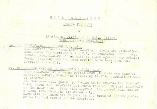 Finally this week, the Wick Garrison Commander, Lt. Col. Haig, evidently felt that some aspects of discipline needed tightening up. He therefore issued an order, part of which gave very detailed instructions on queuing for petrol at 7th Camerons’ pump at Mowatt’s Garage, Wick. (“All vehicles will queue up … along the Ackergill and North road at 100 yard intervals … care will be taken not to park in the queue at narrow places or on the bad corner at the hospital” – the garage was situated on George Street and is now the Caithness Tyre Company; the hospital referred to would have been Bignold Cottage Hospital)