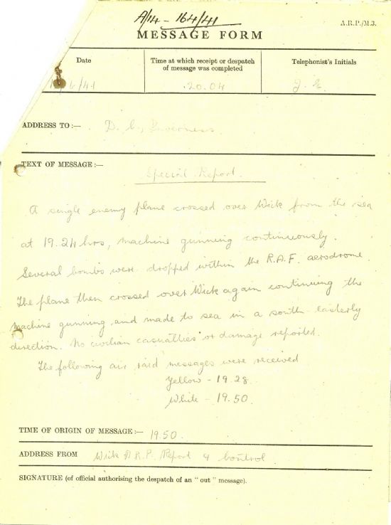 Then, on Thursday, “A single enemy plane crossed over Wick from the sea at 19.24 hours, machine gunning continuously. Several bombs were dropped within the R.A.F. aerodrome. The plane then crossed over Wick again continuing the machine gunning and made to sea in a south easterly direction. No civilian casualties or damage reported.”